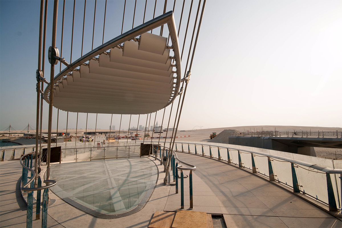 The canopies are incorporated into steel cables that are affixed to two concrete pylons that both support and link the twin bridges. Eight canopies in all will provide shade and shelter from the desert sun over what will be glass-bottomed rest/refreshment/cafe spaces on the bridges walking paths.