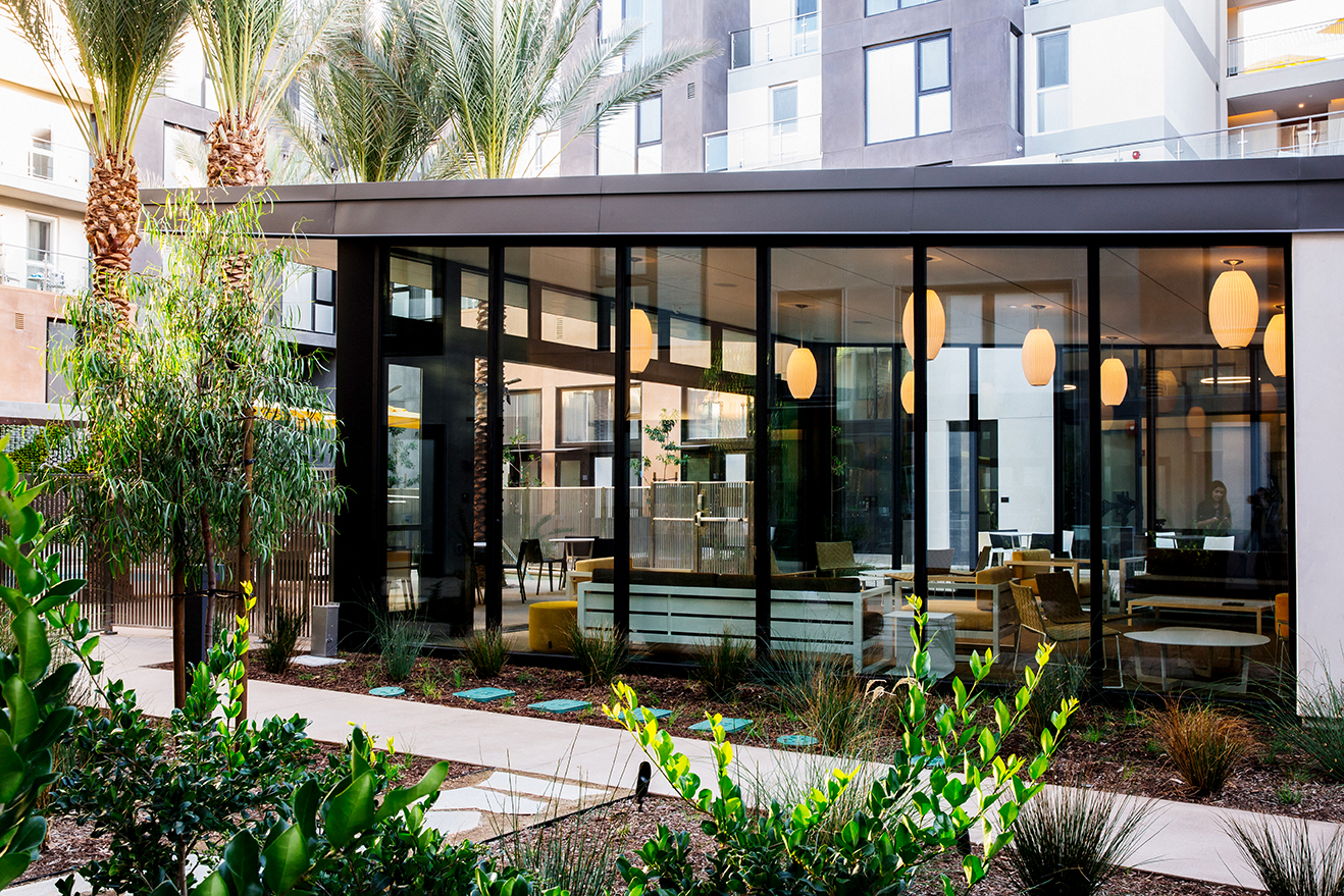 The building is comprised of 197 residential units; a mixture of studios, 1 and 2 bedroom apartments, and 3-bedroom ground floor townhomes with private patios. Above-ground residences are stepped back, providing terraces and balconies for each unit. The adjoining community kitchen/lounge and pool are flanked by an outdoor picnic space and multiple gas grills on one end, and a massive green wall on the other.
