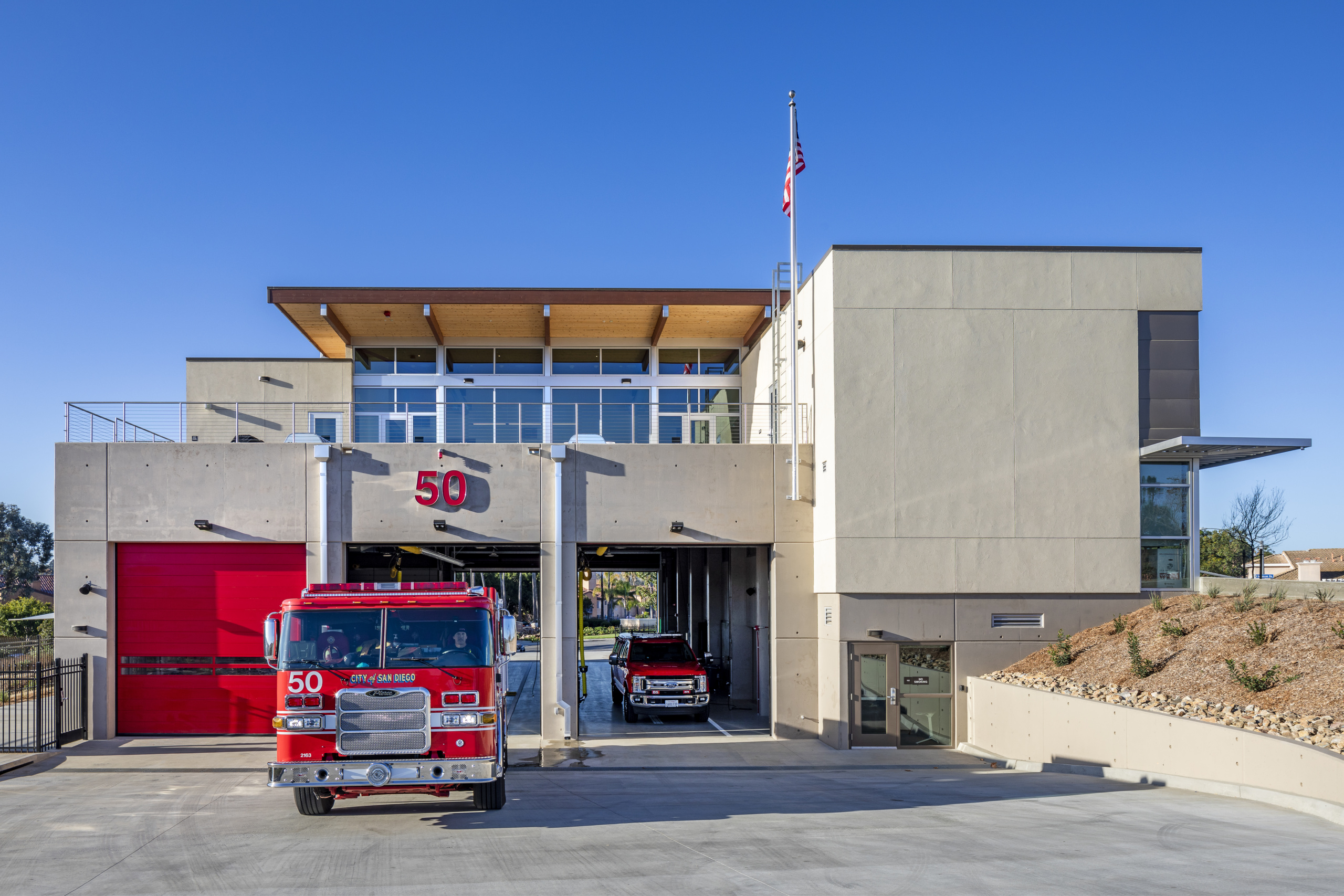 Fire Station 50 sits on the idyllic Rose Canyon in the University City neighborhood of San Diego, CA. Devised as a 3-story structure to minimize its footprint and diminish impact to the canyon and vegetation, it is surrounded by native, non-invasive, drought-tolerant landscaping that’s maintained by the firefighters. The 12,000 SF facility includes three apparatus bays, a sleeping area for 10 firefighters, a kitchen, dining area day room, “ready room,” and gym/training room. Living areas are located on the top floor along with a large outdoor terrace, capitalizing on the light, air and views of the canyon. Housing features including a massive rooftop terrace create a functional and uplifting environment for its residents. The project is targeted for LEED Silver.