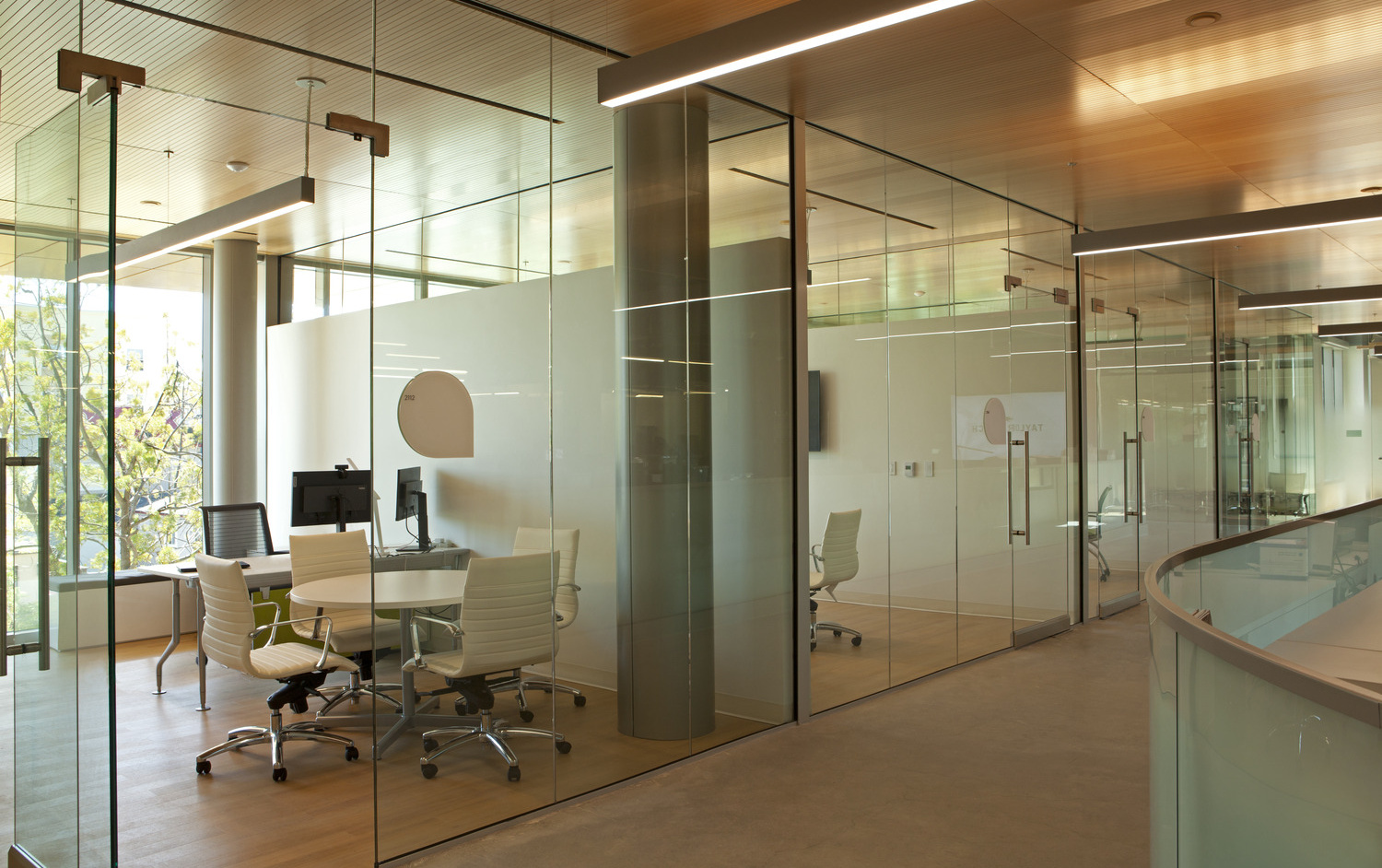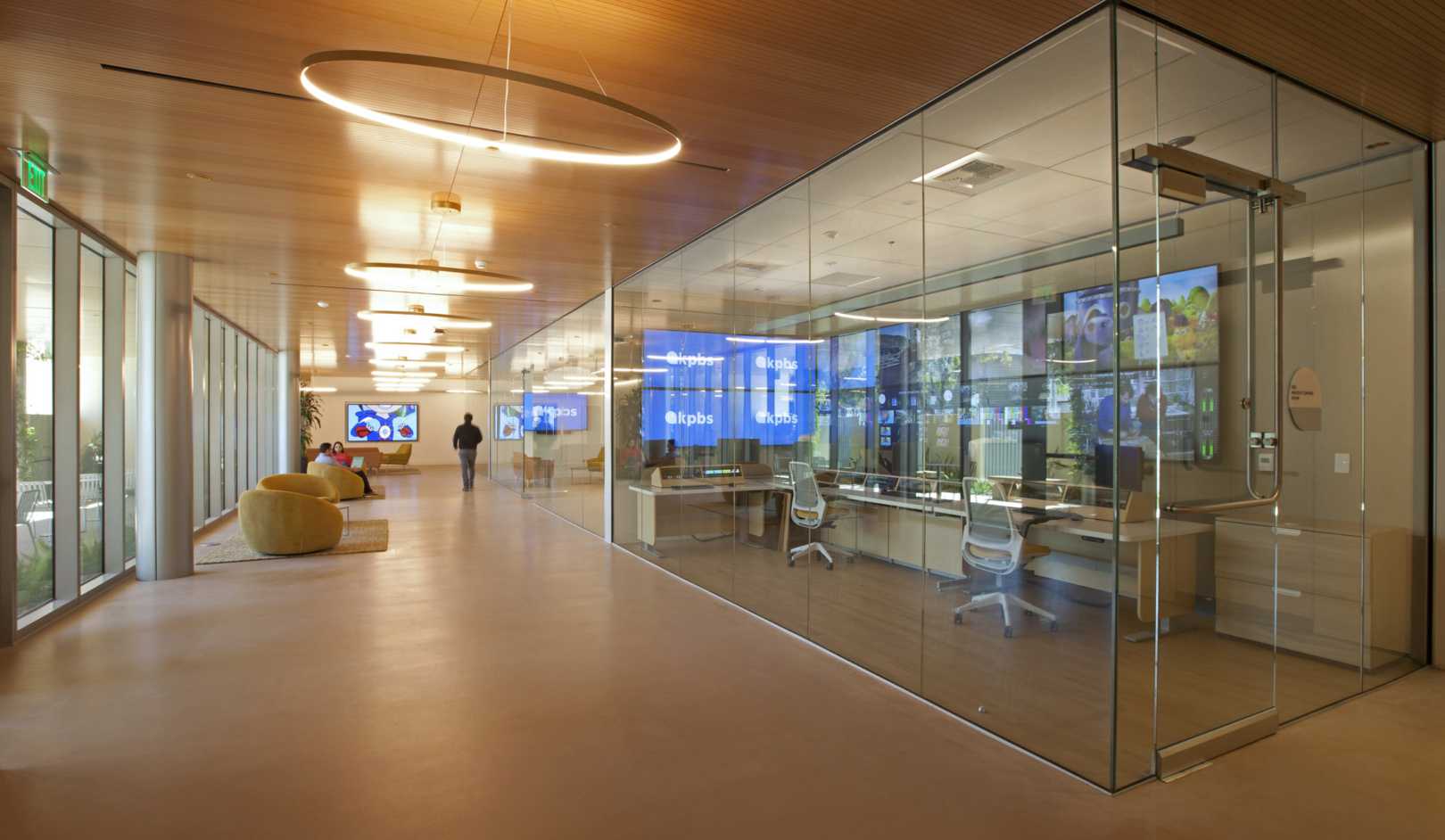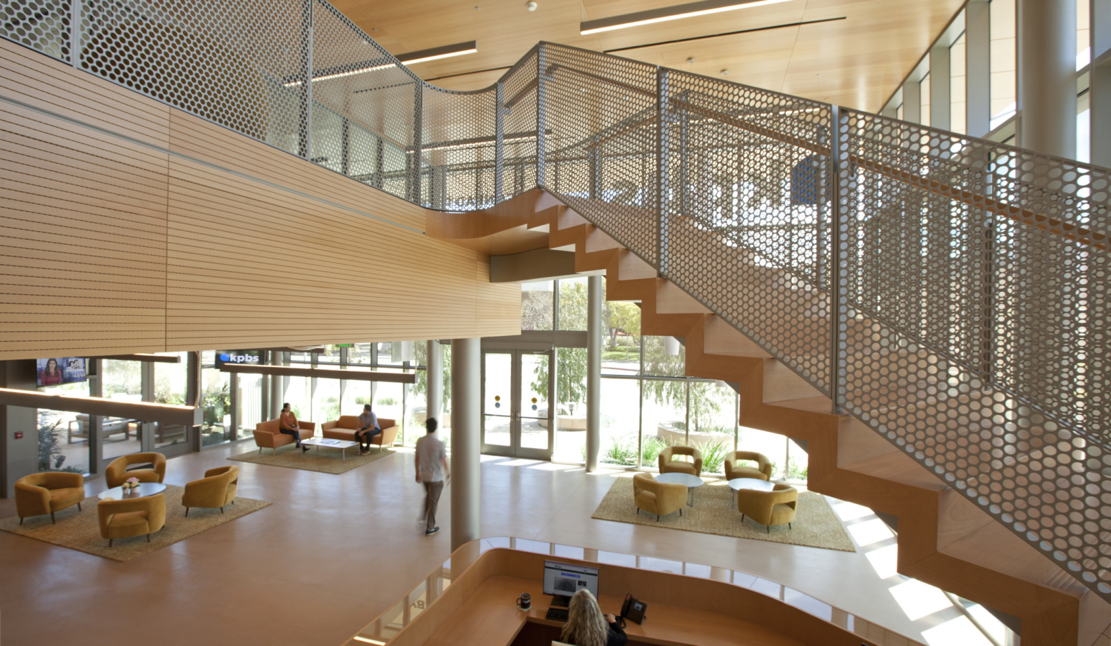 The KPBS building has been designed to maximize energy performance without sacrificing access to daylighting and views, creating a heathier work environment for its occupants. Large roof overhangs, deep eyebrows and high-performance glazing provide solar protection throughout the design. At the double height lobby areas, an encapsulated metal mesh within the insulated glazing was used to reduce heat gain and control glare.