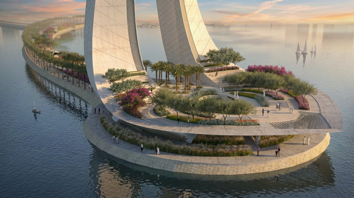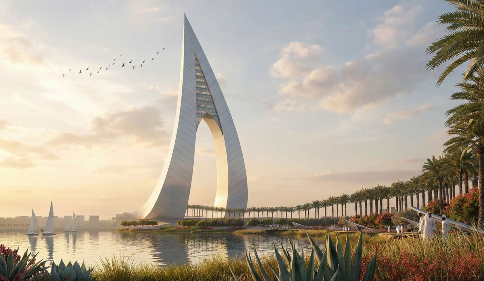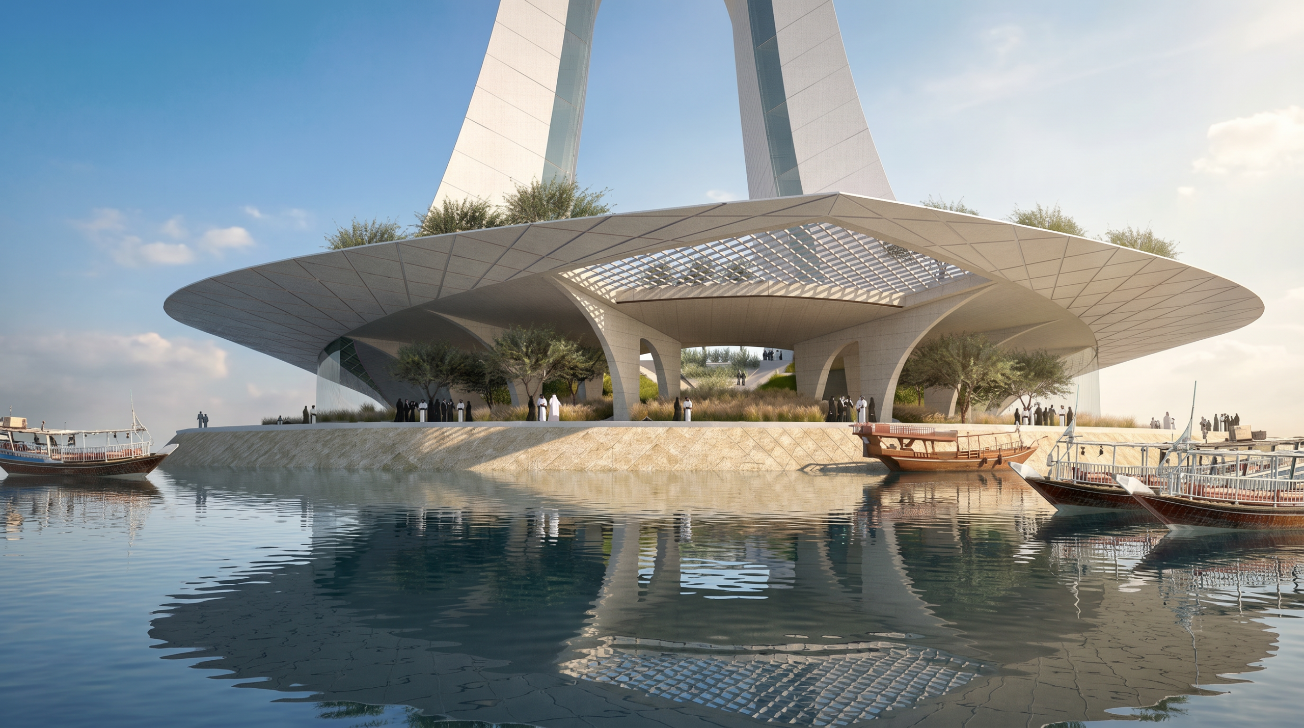 Developed for an international competition with a goal to “build a structure of the highest design that reflects the attributes of Qatar and its home city,” the design for the structure envisions a jewel adorning the “necklace” of Safdie Rabines designed bridges draped along the ring of the marina. The structure resembles a pendant suspended in the sky, dancing with the sun, moon and stars. It is at once a sculpture and a functional building, creating a distinctive place of gathering and celebration that invites, collects, and embraces the people of Qatar. The unique vigor in this peninsula’s exposure to the elements: sun, wind, water and sand, bestow both vitality and hardship, and have shaped the course of human history – this region’s culture in particular. The elements are a source of inspiration for a structure that celebrates nature and observes the rich traditions of the local culture. The structure is abstract, yet reminiscent of familiar forms; a sail in the wind or a wave in the ocean, delicate yet powerful, grounded yet ethereal. Ultimately the subtlety of its form simply calls to mind nature, allowing the structure to be dramatic yet with a sense of belonging. Its sweeping form gestures towards the sky, yet the structure remains firmly grounded, connected to nature, and belonging to the people.