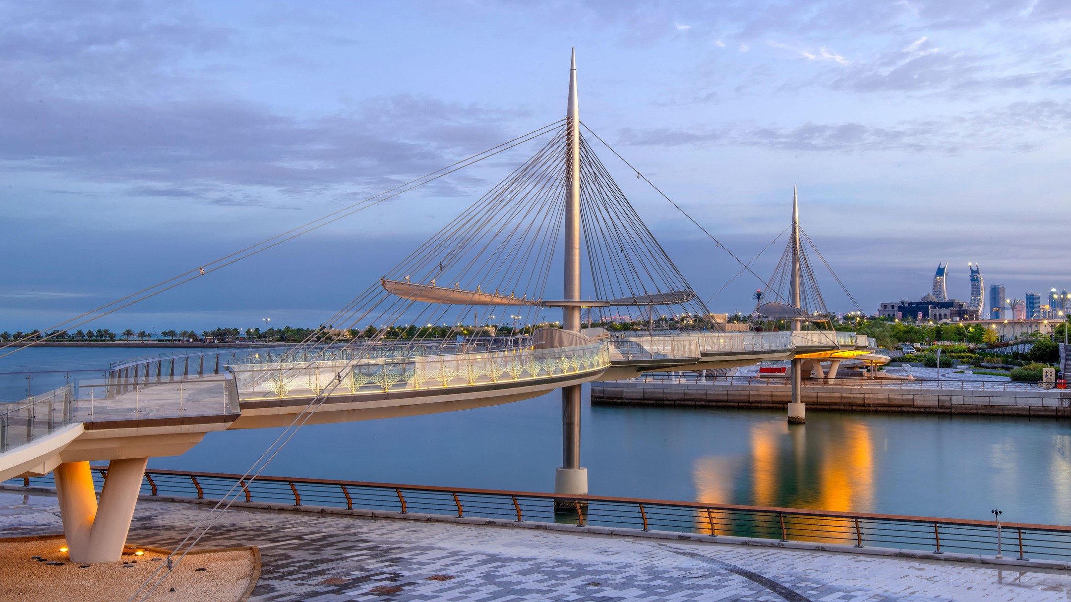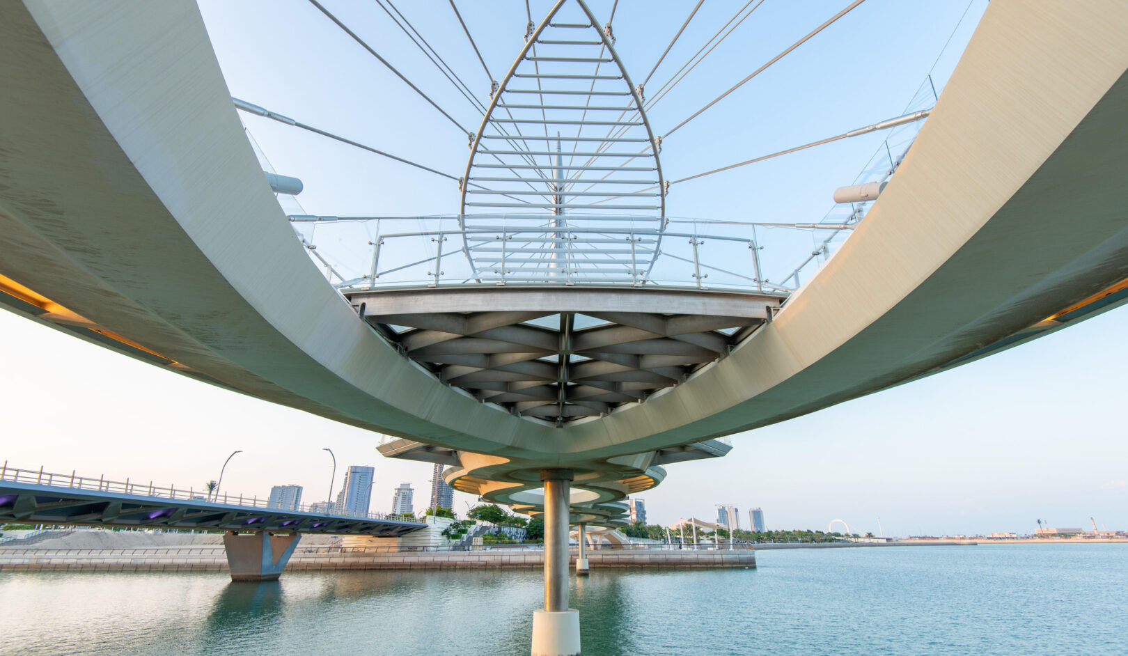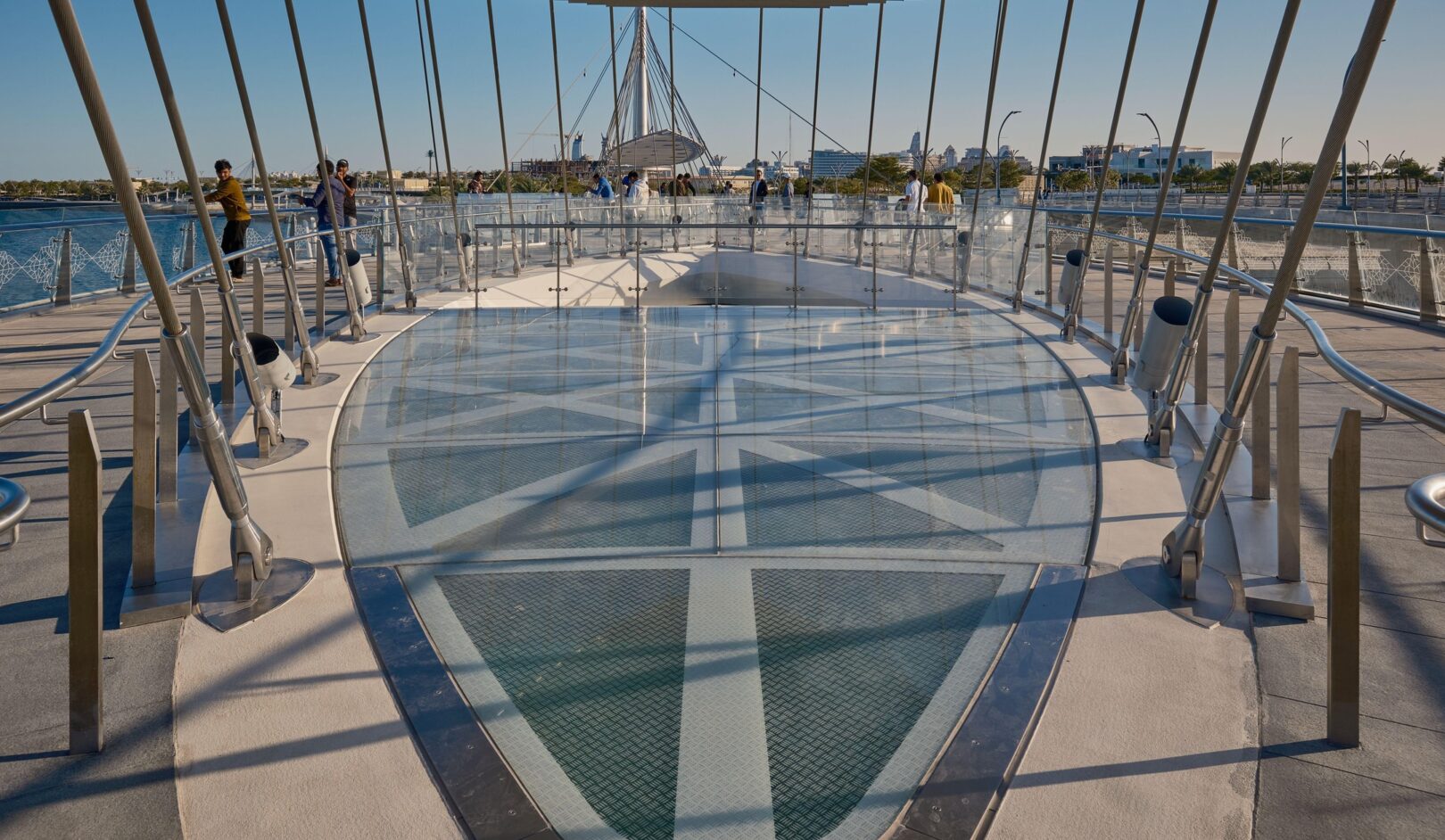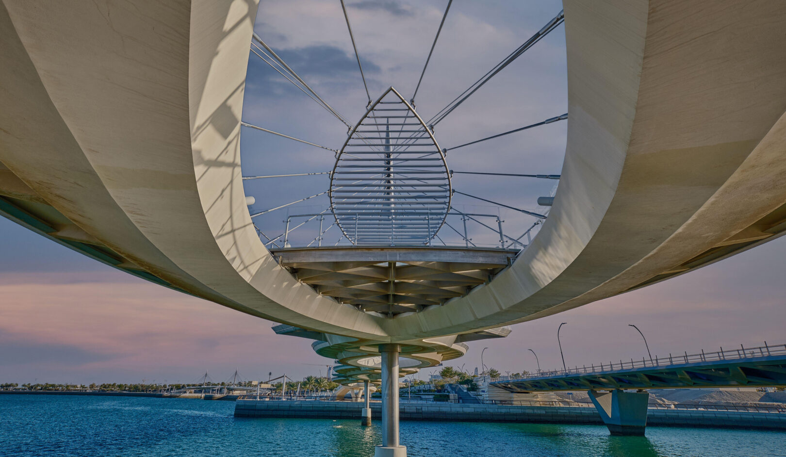 Inspired the city’s theme, Water is Life, the design of these twin pedestrian bridges is that of a delicate “necklace,” draped along the ring of the Qetaifan Island Marina. The bridge’s curves trace the radius of the island’s waterfront, while separate walkways weave across the channel creating a chain, its links supported by stainless steel cables affixed to two concrete pylons. The cables are connected to the deck in alignment with the two paths, intertwining the pedestrian experience of each bridge with the structural system that supports it. The experience of the bridges continues beyond the boundaries of their sites; through the use of pattern and repetition in on-grade pathways, the necklace motif links both bridges and extends their character along the entire promenade.