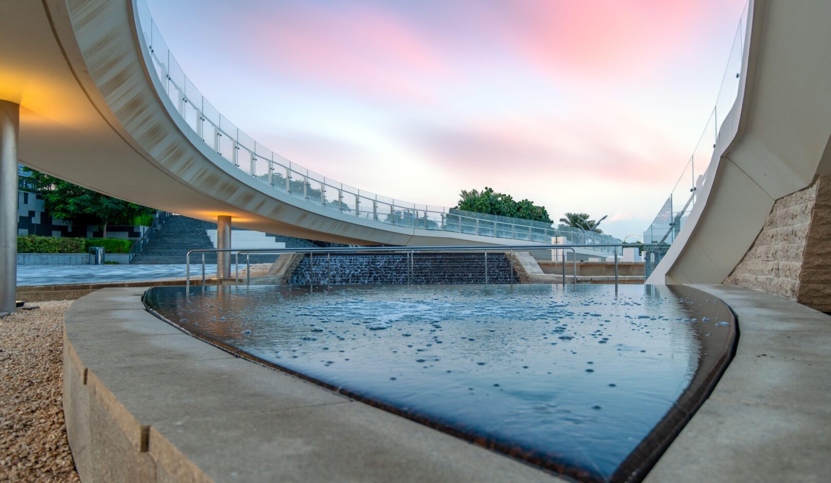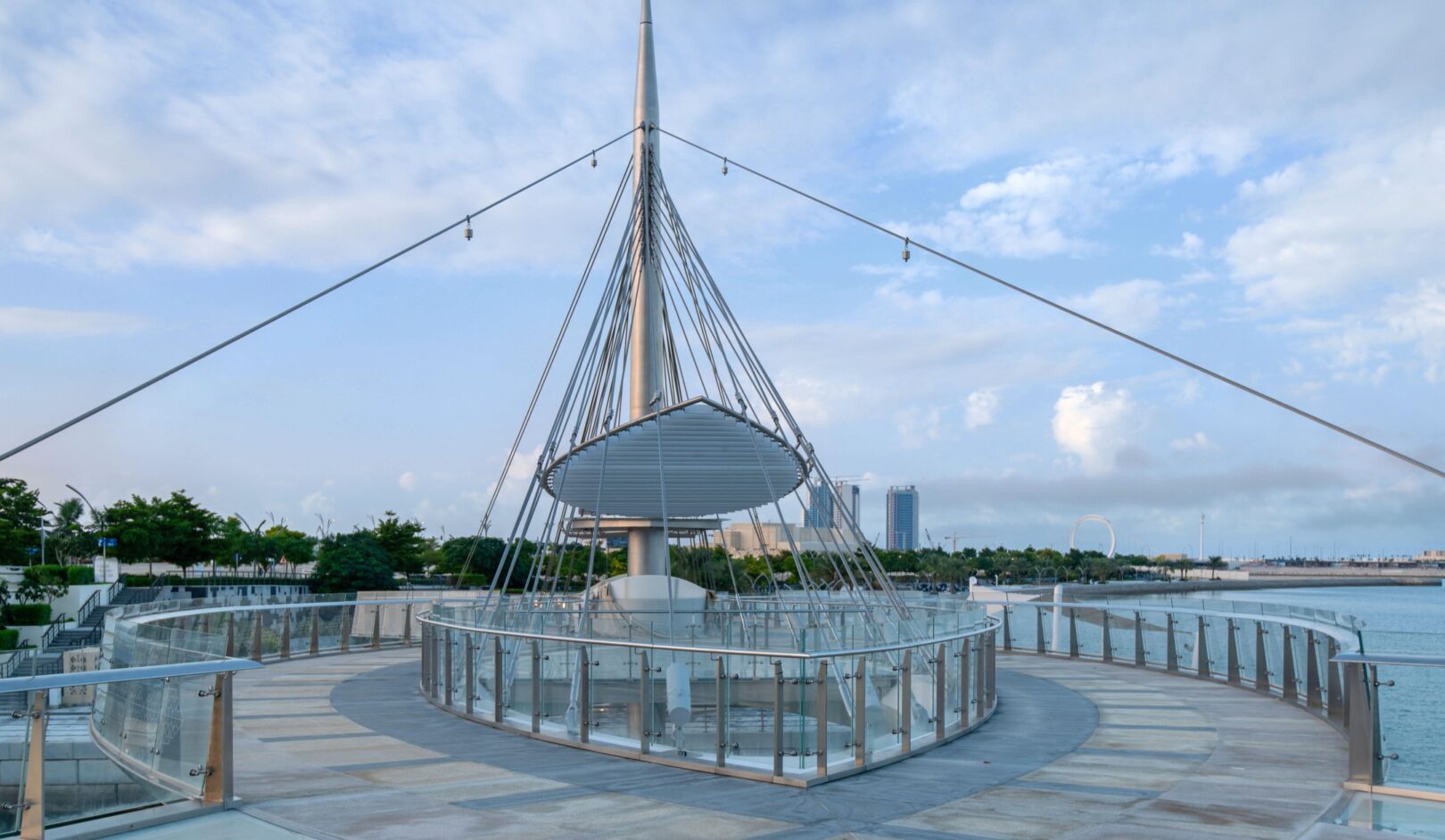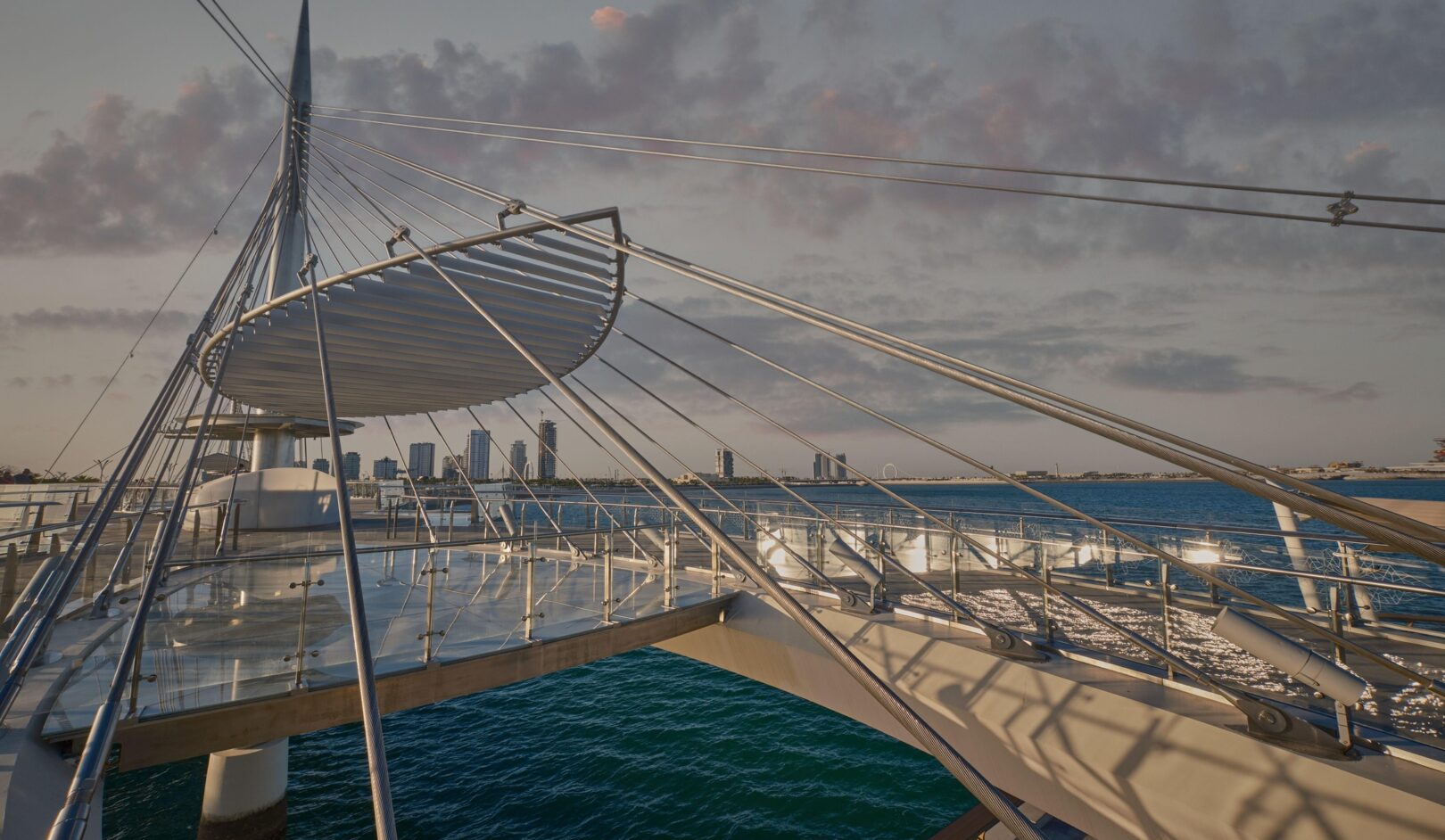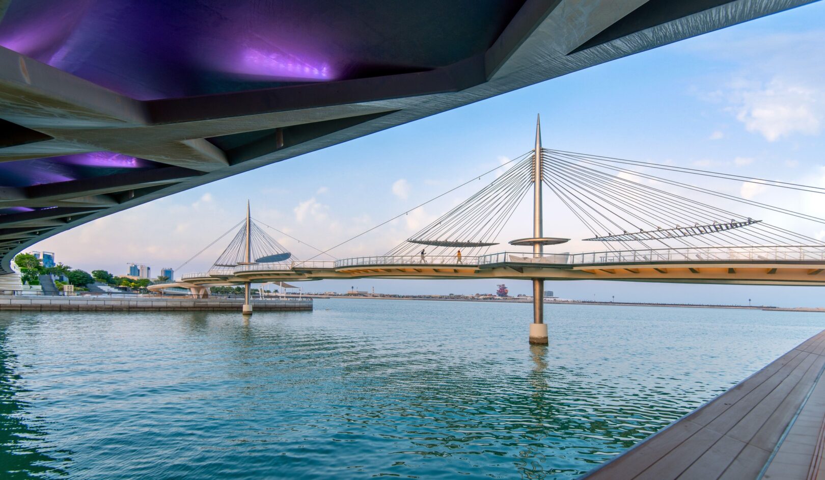 Inspired the city’s theme, Water is Life, the design of these twin pedestrian bridges is that of a delicate “necklace,” draped along the ring of the Qetaifan Island Marina. The bridge’s curves trace the radius of the island’s waterfront, while separate walkways weave across the channel creating a chain, its links supported by stainless steel cables affixed to two concrete pylons. The cables are connected to the deck in alignment with the two paths, intertwining the pedestrian experience of each bridge with the structural system that supports it. The experience of the bridges continues beyond the boundaries of their sites; through the use of pattern and repetition in on-grade pathways, the necklace motif links both bridges and extends their character along the entire promenade.